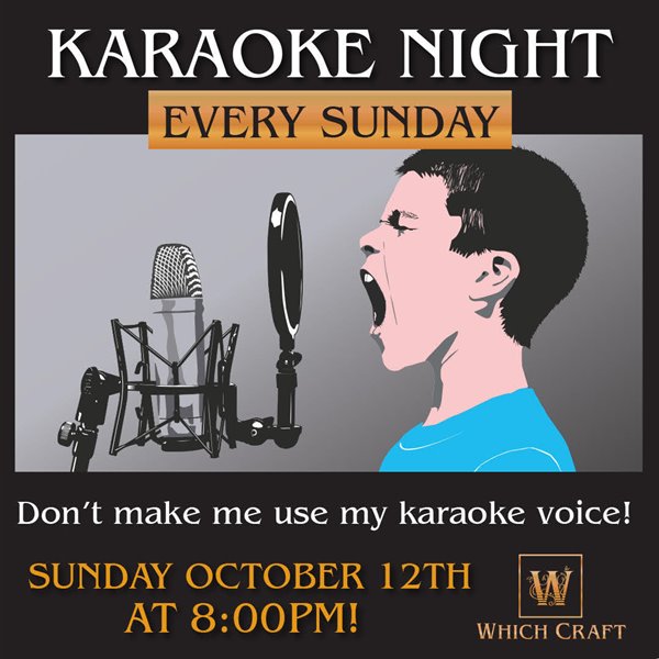 Sunday KaraokeWhen: Sunday Oct 12th, @ 8pm Where: WHICH CRAFT - 91 Wyndham St N, Guelph Info: Sing Your Weekly Frustrations Away! - Starts @ 8pm KARAOKE! TONIGHT @ 8:00PM Don't make me use my karaoke voice! Drop by tonight and enjoy our Bar Rail $5.50!