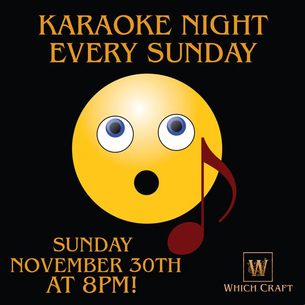 Sunday KaraokeWhen: Sunday Nov 30th, @ 8pm Where: WHICH CRAFT - 91 Wyndham St N, Guelph Info: Sing Your Weekly Frustrations Away! - Starts @ 8pm